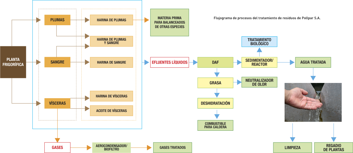 Como resultado del proceso de faena de pollos, se producen distintos residuos, tanto sólidos como líquidos y gaseosos. El cuidado al medio ambiente exige que Pollpar transforme dichos residuos en productos de valor comercial, que luego son destinados a diversas industrias